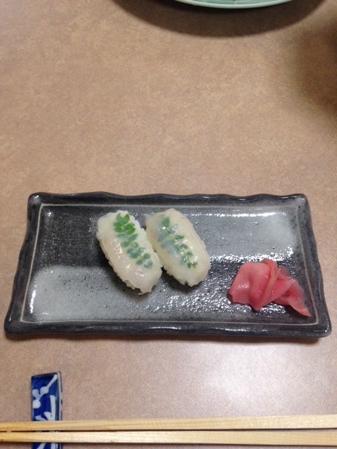河豚握壽司 (裡面是山椒的葉子)