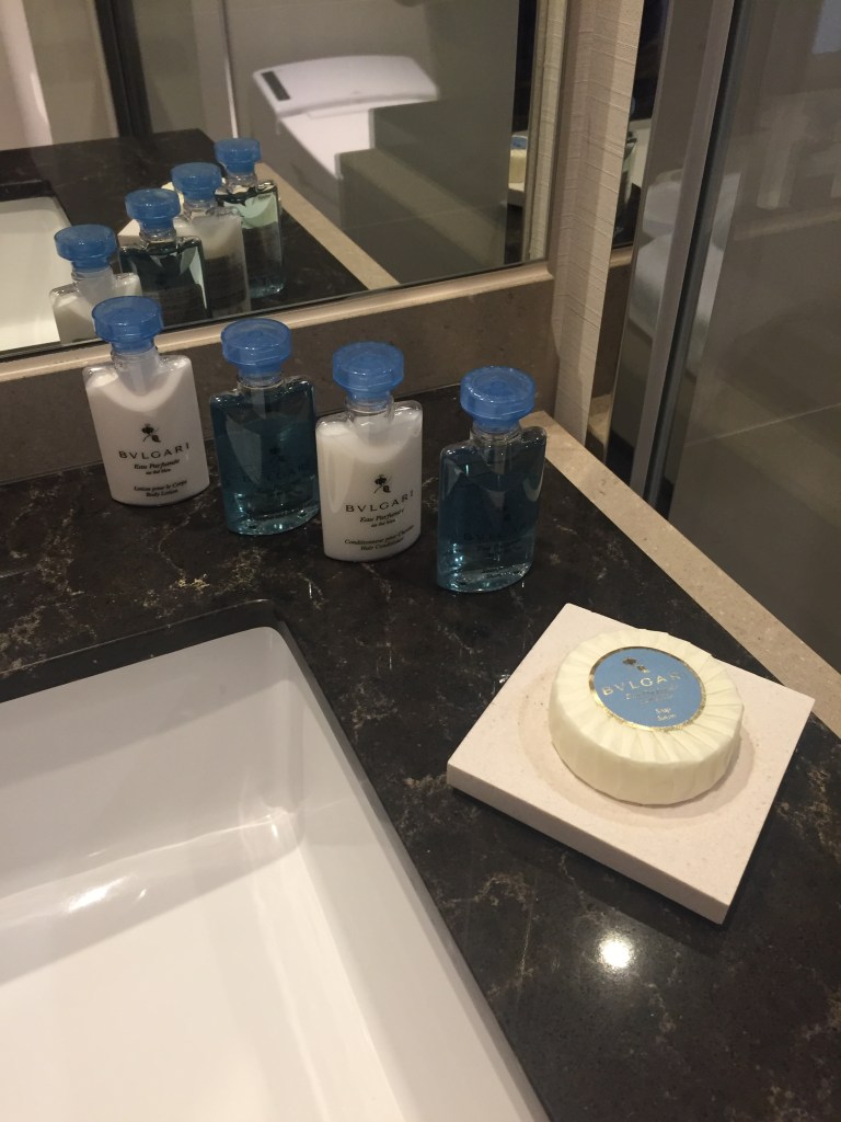 浴廁乾濕分離設有花灑,浴缸夠深、備品的牌子掛的是寶格麗,用起來也算舒適。