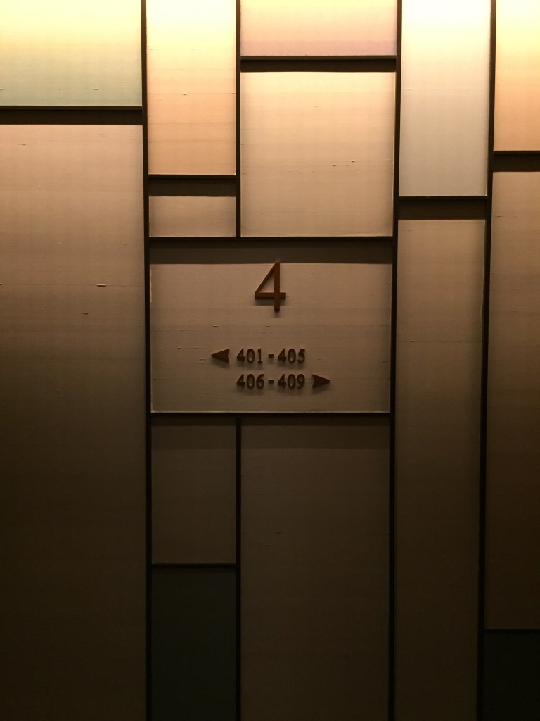 從一樓的平面圖可以看出其實客人的活動空間真的不大,基本上就是你沒事不會想要待在那兒。Reception下面黑色部分應該是用來放置散客行李的,上面黑色有一部分應該是用來做辦公室,但絕大部分其實是用來停車卸貨的空間。酒店有地下一層,估計應該是 Back of House。這次住的是4樓,應該算是標準層,一共有九間房間。