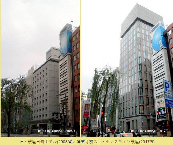 在我入住的時候,如果在街上對著在地人說我住在『ホテル ザ セレスティン銀座』(Hotel The Celestine Ginza),很多人大概沒聽過或是沒印象這家酒店在哪裡,但如果改口:就是以前的『銀座日航ホテル』(Ginza Nikko Hotel),應該大部分的人都會有印象吧,因為這基地上原本的建物是銀座日航酒店,約莫營運了半世紀後,於2014歇業,隔年開始為期約兩年的新建工程。
