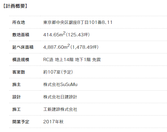 最後SuSuMu決定與三井不動產集團合作,規劃酒店落成後由三井不動產承租,酒店營運則交由該集團旗下的三井不動產酒店管理公司。2015年4月27日,株式會社SuSuMu、三井不動產株式會社以及株式會社三井不動產ホテルマネジメント共同發布新聞稿,宣布:『銀座8丁目酒店計畫』開工以及酒店預計2017年秋天開幕。