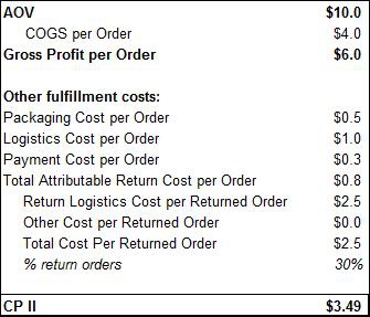 接下來看直接成本面,也就是完成交易所產生的成本,而這些成本通常是隨著交易量變動的(Variable Costs)。如果賣的是產品,第一個直接成本就會是銷貨成本(Cost of Goods Sold, CoGS),剩下的就是毛利,或稱為第一級貢獻利潤(Gross Margin, 同時也稱作Contribution Profit 1, CP1)。接著則是其他為了完成該交易所引發的成本(Fulfillment Costs),包括但不限於:包裝成本(Packaging Cost )、送貨成本(Delivery Cost)、支付成本(Payment Cost)以及銷單所引發的成本(Cost of Returned Order)…剩下的利潤稱作第二級貢獻利潤(Contribution Profit 2, CP2),基本上行銷費用會放在CP2之後。