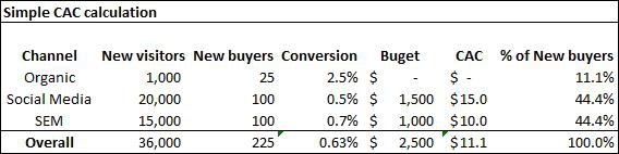 首先必須透過各種渠道獲取新的顧客,CAC的計算方式就是撒在那些渠道的錢除以獲得的「新」顧客數。舉例來說,在某渠道花了$1000,經過層層的漏斗,最終有20個新顧客下單,那麼平均取得每一個新顧客的成本就是$1000/20=$50。有些渠道看起來是不用錢的,例如有機搜尋,當然如果放很多精神與資源在SEO上,那些有機的流量自然也不是免費的,但因為聘人做SEO的費用相對固定,因此在規模擴大時可以取得較為顯著的營運槓桿。公司同時透過不同渠道獲得新客戶,基本上整體的CAC就是各個渠道的加權平均。