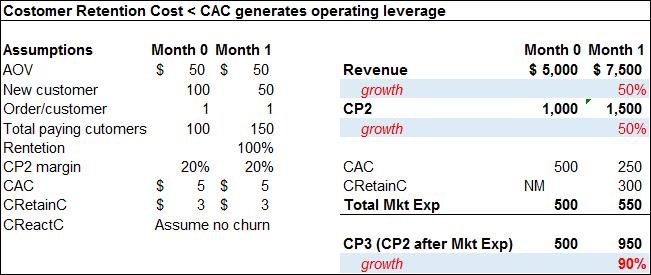 一般來說CAC會大於Customer Retention Cost 與 Customer Reactivation Cost,這也是行銷費用為什麼具備槓桿的特性 (不考量所謂口碑效果 、網路外部性…所造成CAC結構性的下降) 。如果CAC亦會隨著規模擴張下降,槓桿將更為顯著。