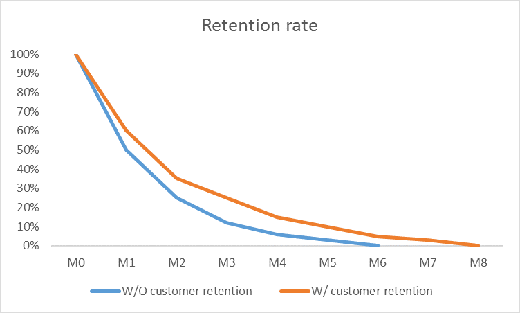 新顧客下單或交易並不代表它會一輩子跟著你,事實上很多消費者在消費生命週期中可能只消費過一次。例如在第0個月獲取了100個新顧客,第1個月時可能剩下50顧客會再次消費,第2個月時可能只剩下25個顧客…其他的顧客就流失了。依據商業模式、產品、服務的不同,顧客流失會服從特定的型式,維繫顧客的成本就是為了減緩客戶流失,例如公司透過顧客關係管理讓第一個月的再次消費顧客數提升到60人…