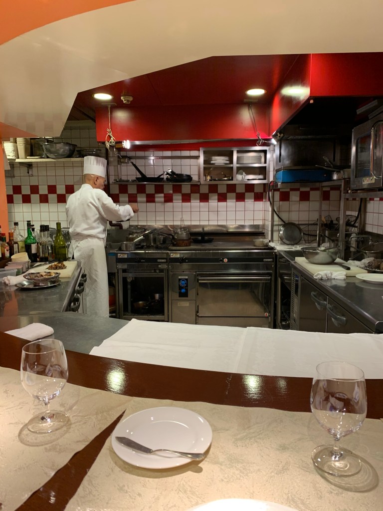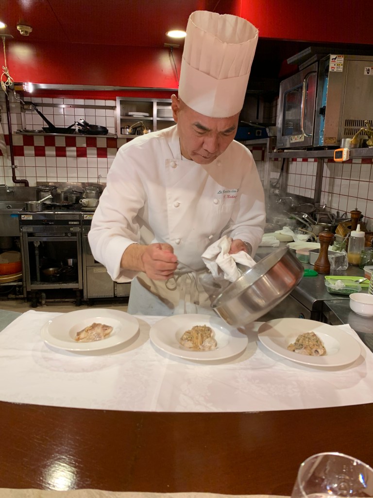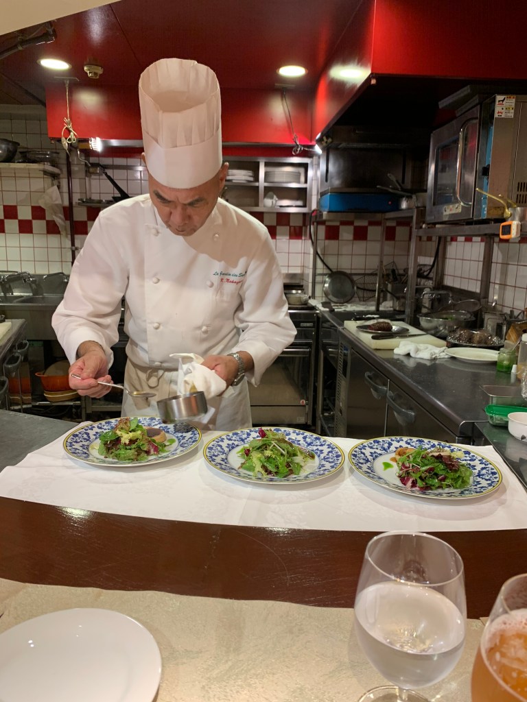我們十一點半入座,下一組客人剛好我們吃完才進來,所以感覺起來就好像包場一樣。看著主廚忙東忙西,一下擺排、一下蒸魚、一下煎肉,從料理的過程可以感受到法國料理的繁複。整體來說這是個非常別緻的體驗,為此次東京行畫下完美的句點。
