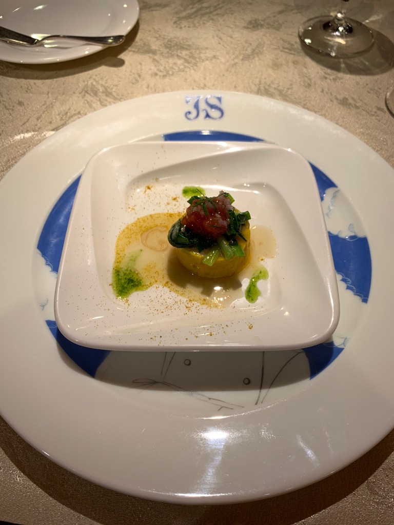 Le Jardin Des Saveurs 是東銀座的老舖 (東銀座站徒步5分), 開店至今已將近三十年,法文店名的意思是「風味的庭園」。這家餐廳最大的魅力在於半圓形吧檯直接面對開放廚房,主廚就在客人面前烹飪、擺盤與交流,臨場感十足。用餐空間小巧精緻,內裝色調走的是熱情的橘色,環境明亮。