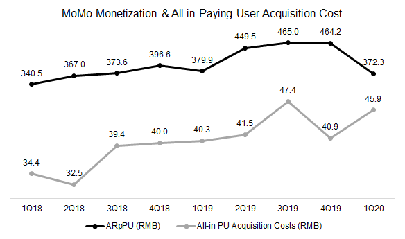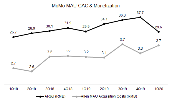 很明顯的,MoMo目前用戶存量已經到了目前產品的天花板,如果產品方面沒有重大的更新或玩法的突破,一般例行性的拉新、留存、喚醒所帶來的用戶增長已經是微乎其微。月活躍用戶量在2019年維持在113M到115M,這可能跟總獲客成本的提高有關。